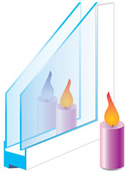 Посмотрите на отражение огонька от спички или зажигалки в стеклопакете. Количество отраженных язычков покажет количество стекол ( сколько отражений – столько стекол). Если Вы заказывали стеклопакет с энергосберегающим стеклом, то второй от Вас язычок должен иметь другой оттенок - сиреневатый.